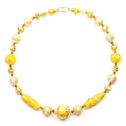 Choker made of reticello, zanfirico, alabastro, opalino and avventurina glass beads, produced between 1950 and 1970, flowered and decorated with avventurina threads, filigrana, and enamel. Small pearls covered with 24-carat gold leaf, separated by a small garnet pearl.