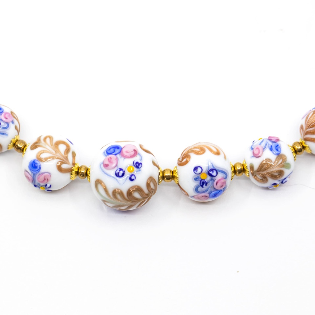 Collana con perle dégradé in vetro pastello bianco decorate con vette di avventurina e vette di smalto e conteria del 1950.